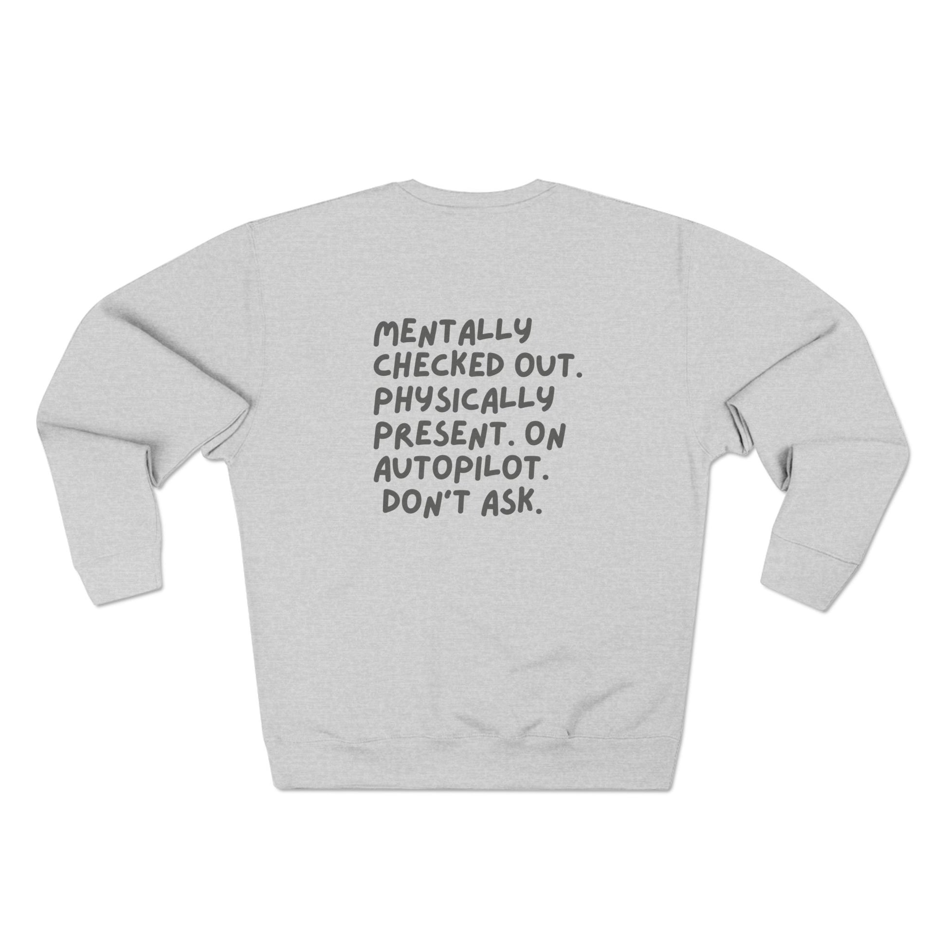 Mentally checked out crew neck comfy style sweatshirt perfect for cozy days at home or casual outings. Ideal for those looking for comfort and relaxation. Relevant for holidays and casual occasions.